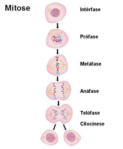A mitose apresenta quatro fases principais: Prófase, Metáfase, Anáfase e Telófase. As principais funções da mitose são a formação dos gametas em vegetais, desenvolvimento embrionário através de divisões do zigoto, crescimento, renovação e cicatrização de tecidos.